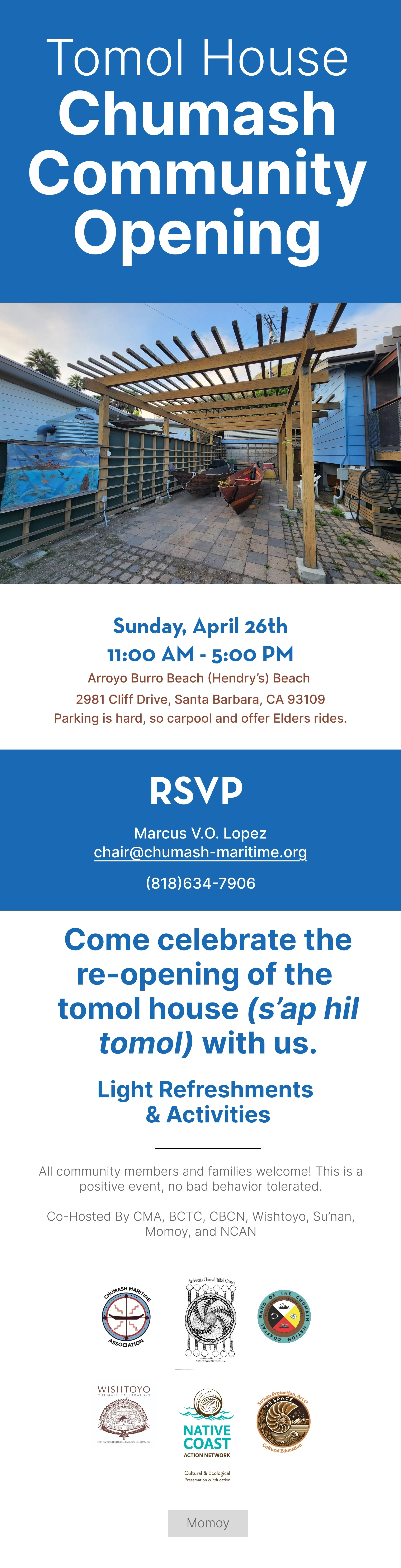 We are excited and proud to celebrate the birth of a new tomol and the re-opening of the Tomol House. This is a chance for our community to come together and honor this occasion in love, connection and hope. We hope you can join us at these events!