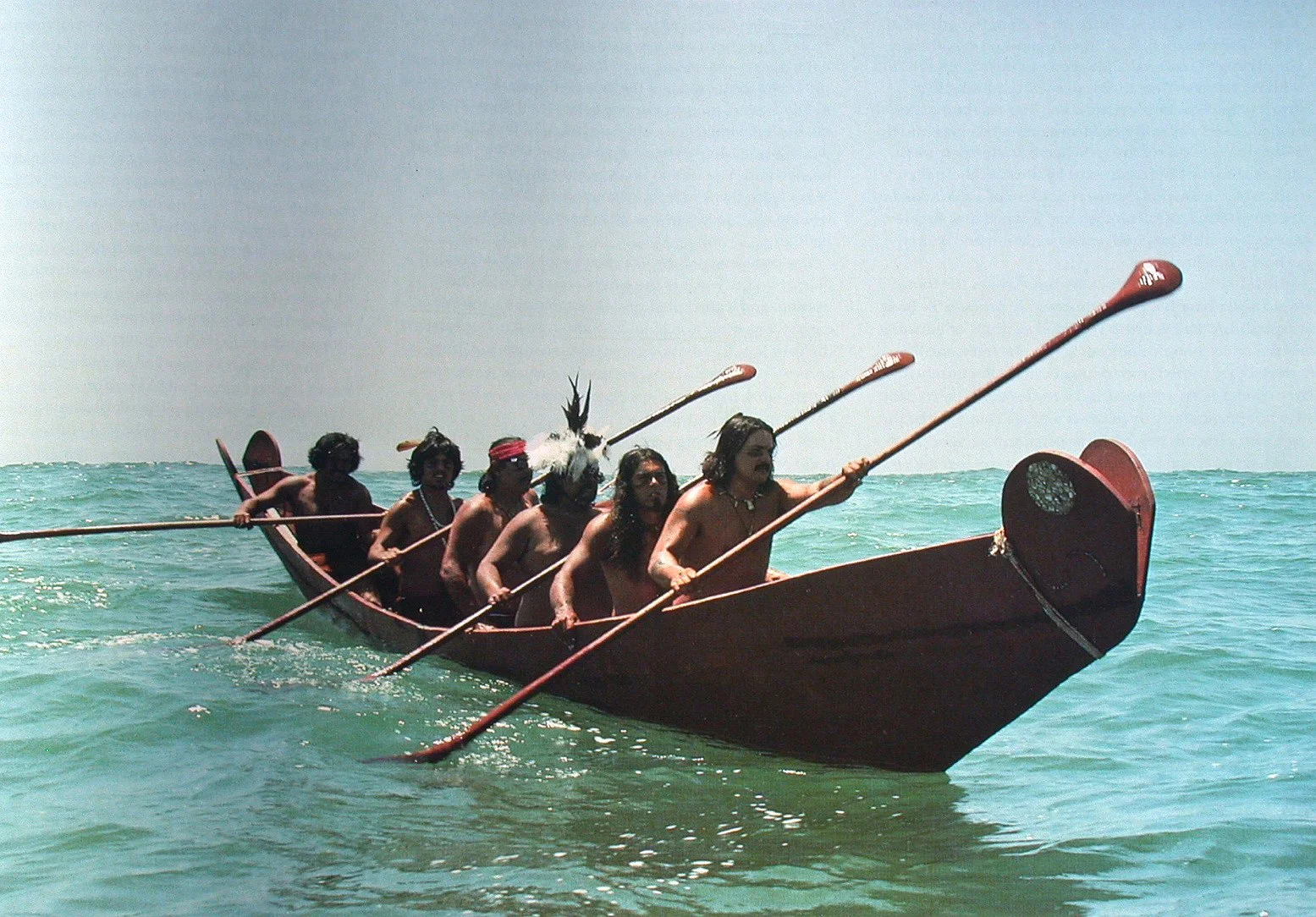 June 1976: Practicing out into open waters of the channel near the oil derrick Platform A. Pictured (front to back): Kote Lotah, Alan Whitebear, Slo'w Gutierrez, Frank Gutierrez, Manuel Estrada, Joe Estrada, Photo: Ernie Brooks