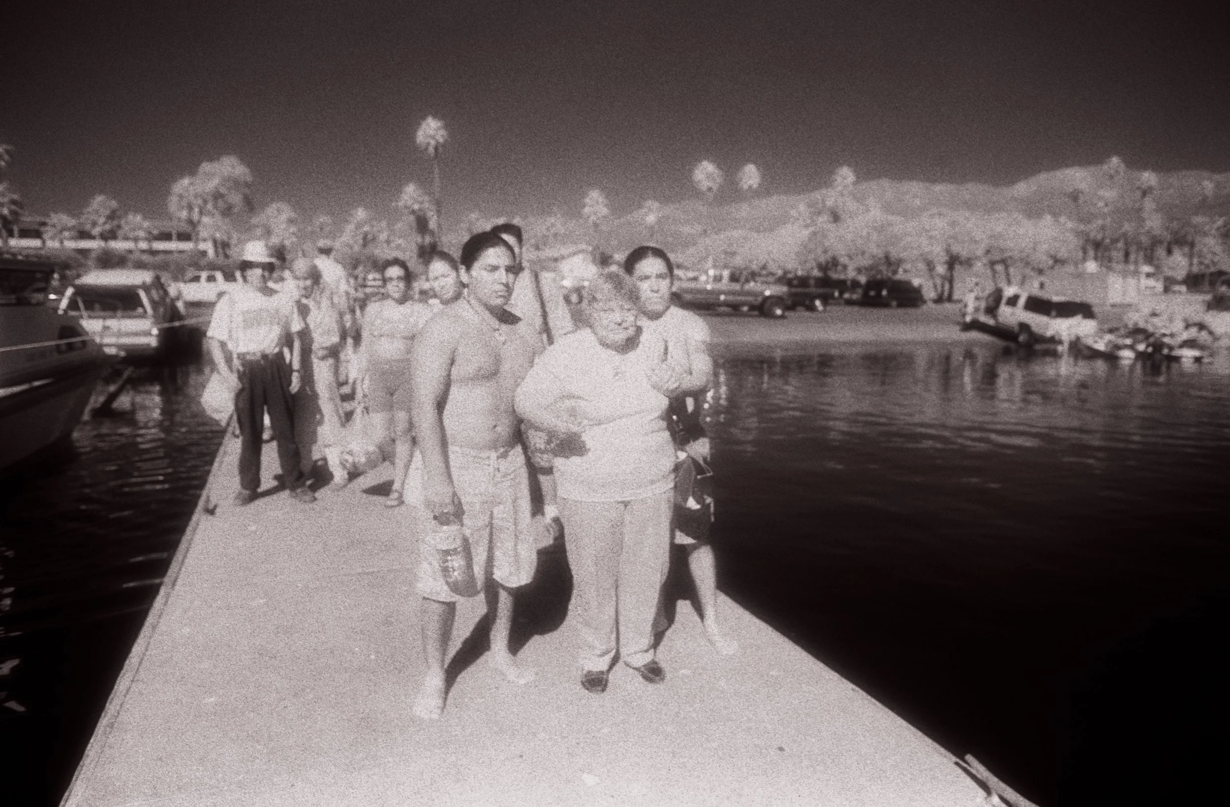 1997: Thanksgiving Day launch of the 'Elye'wun in Santa Barbara. Chumash community members and paddlers lead Grandma Stella Rivera (Coastal Band) to the tomol so she can go for a ride. Photo: Althea Edwards