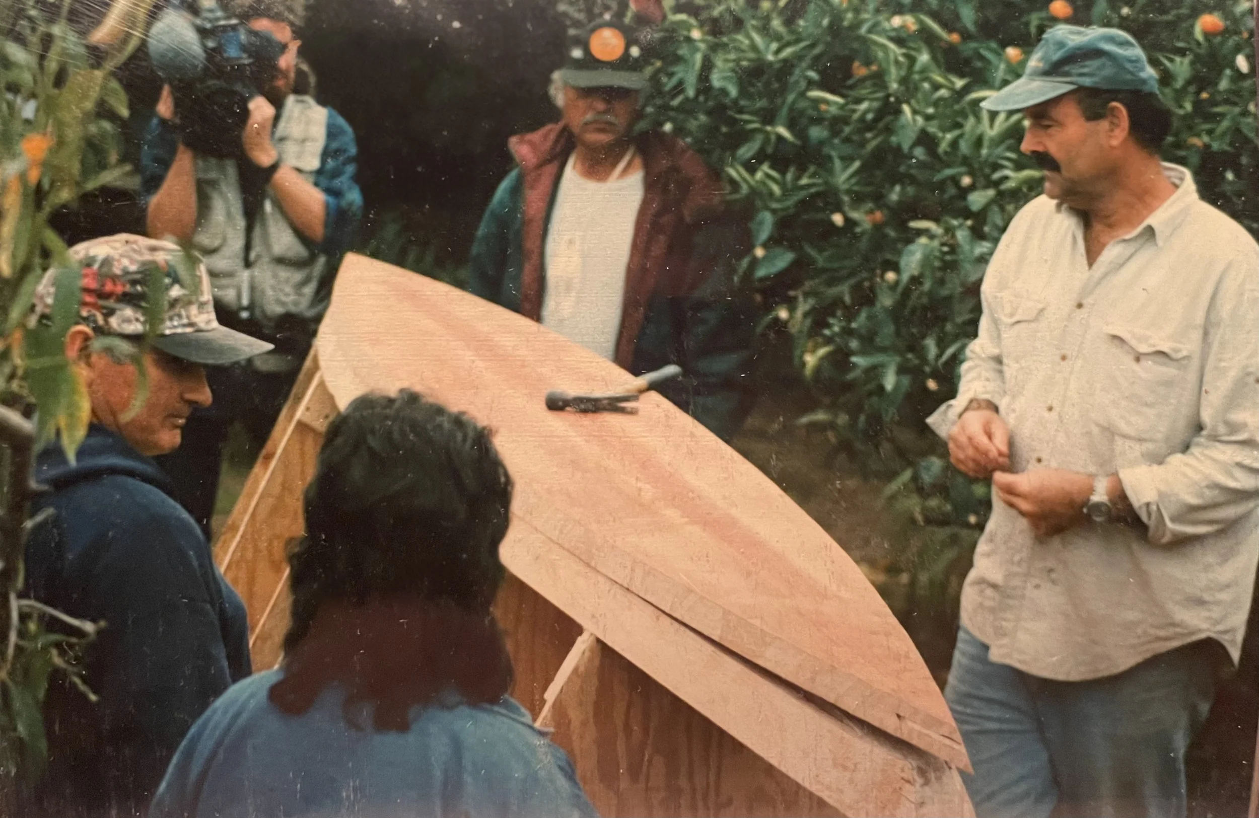 1997: The 'Elye'wun's base board is being laid on here, built on the jig created for the two tomol (Yuxnuc and 'Alolk'oy) that Marcus Lopez (not pictured here) built in 1996 for the Santa Barbara County Education Department. Pictured (clockwise from top): Jose Castillo, Peter Holworth, Roberta Cordero (Coastal Band) with misc film crew members. Photo: Julia Cordero