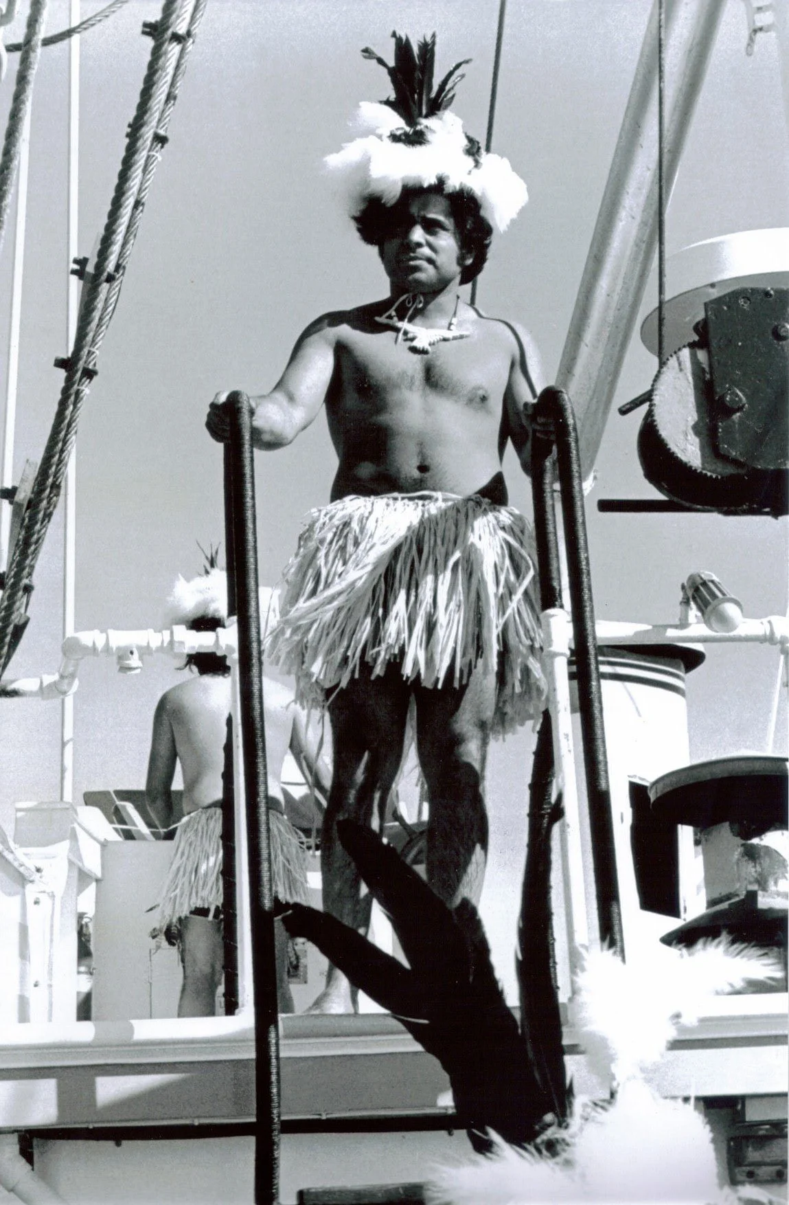 June 1976: Open ocean between Santa Rosa Island (Limuw) and San Miguel Island (Tuqan). During the 11 day journey throughout the Santa Barbara Channel Islands. Pictured: Kote Lotah Photos: Ernie Brooks