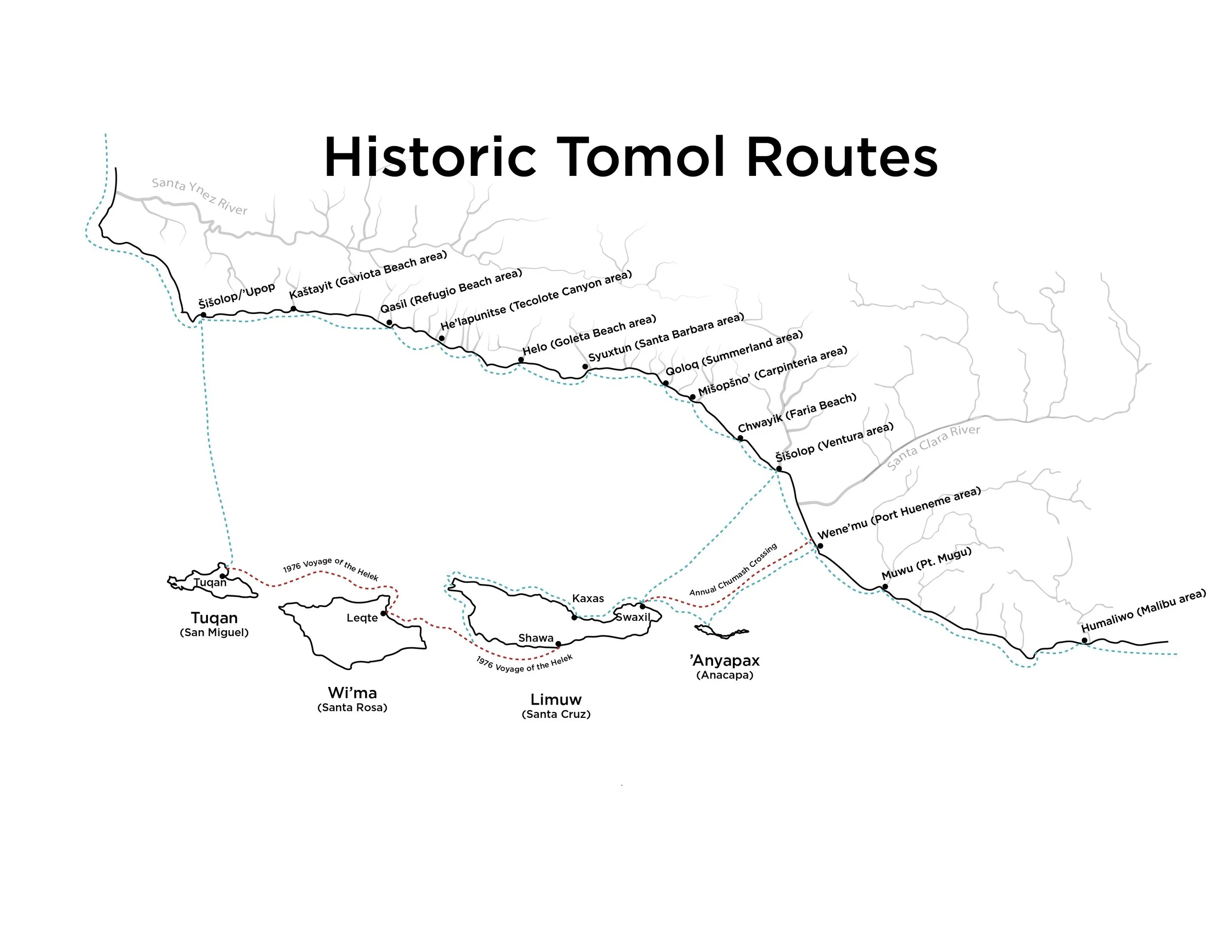 - Chumash tribes to gather together during the summer for “village hops”—near shore paddles at or between the coastal communities of Avila Bay, Hollister Ranch, Dos Pueblos, Goleta, Santa Barbara, Carpinteria, Ventura, and Malibu.